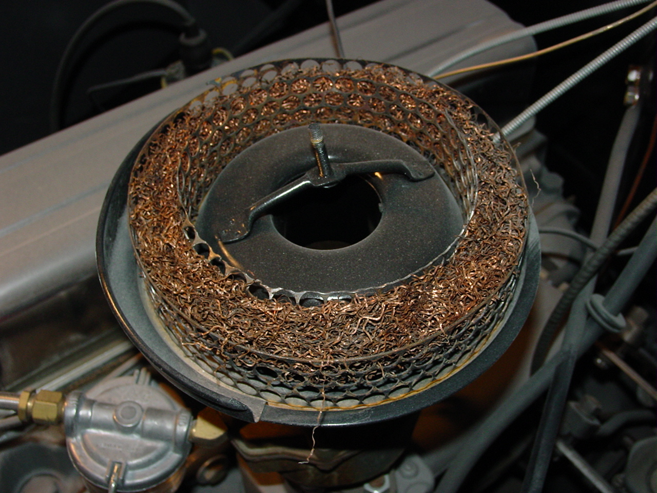 These are shots of a dry filter taken while on the truck. The reason it wasn't real desirable was its copper filling. You had to wash this filter with Kerosene every 2000 miles and re-oil and drain before re-assembly. The copper also broke down over time, and this copper was likely to get sucked into the carb, thus possibly causing premature engine failure. Fortunately for us, the vendors carry new original filters for this style. I just went with a modern type myself. There is the question of the modern filter allowing for the volume of air that a 261 sucks in, but no, that isn't an issue at all.