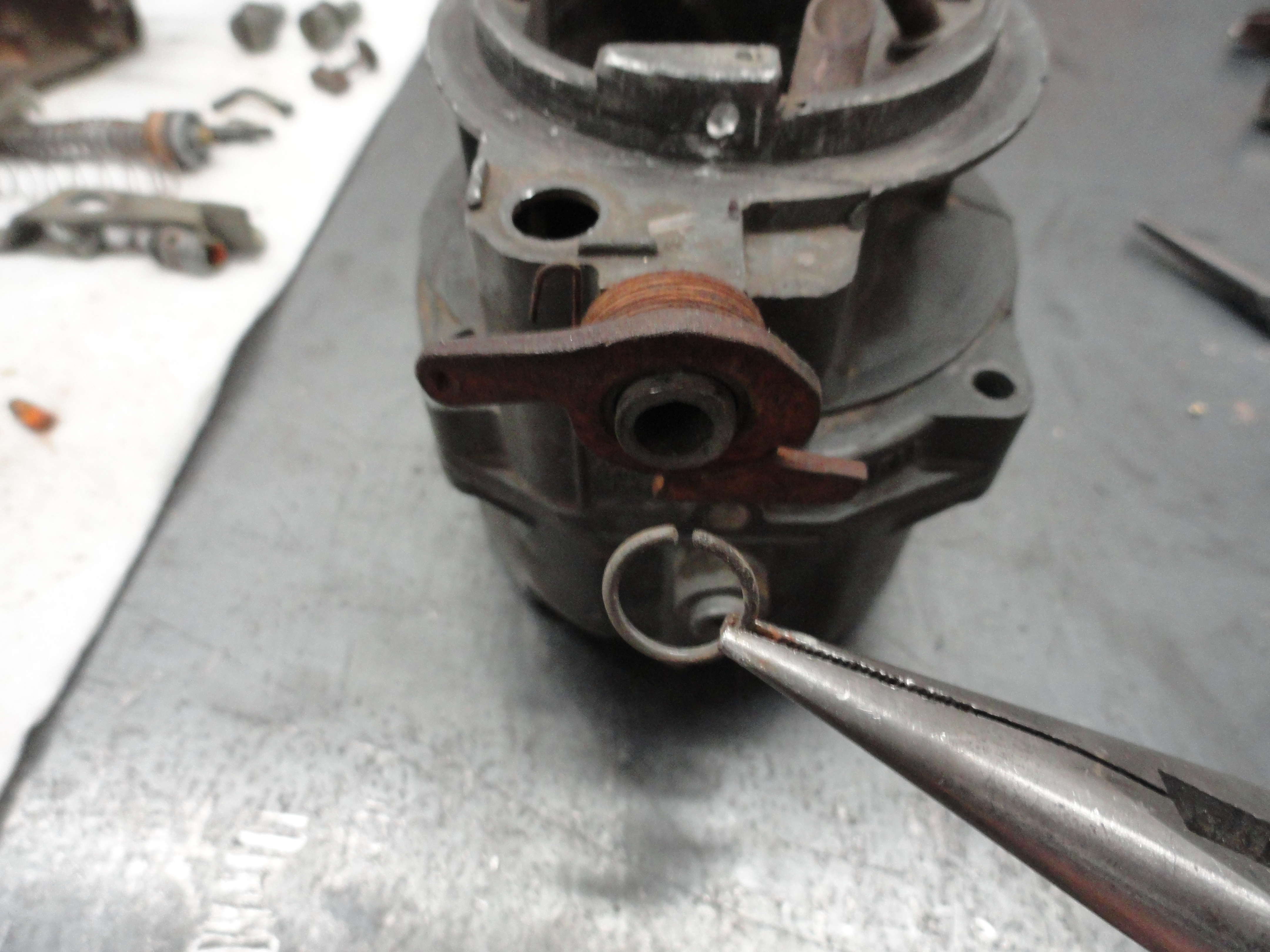 It's important to go back and look at some of the disassembly photos to make sure you are assembling correctly. Now let's look at the Float Bowl or body of the carb. We want to put the Accelerator Pump back where it belongs. Only there is one in the Kit, so let's use the new parts. You will need the spring that goes under the pump, put that in first. Then the heavy spring goes around the pump itself. Push all of that down in the hole and put the pump bracket in its slot in the body, and push them both down until you can get one of those U-shaped keepers in its slot to lock it all down. I found this much easier to do on the carb as opposed to wrestling with it on the table. Don't forget the lighter spring goes in first. Squeeze the U-shaped locker to keep it from coming off. Now that the assembly is put together, from the outside, re-attach that little linkage from the bottom of the Accelerator Pump assembly to the butterfly assembly on the base. It points IN with the dogleg facing OUT. Use the smallest clips in the new Kit to secure. You should now have an accelerator linkage that springs back by itself.