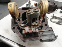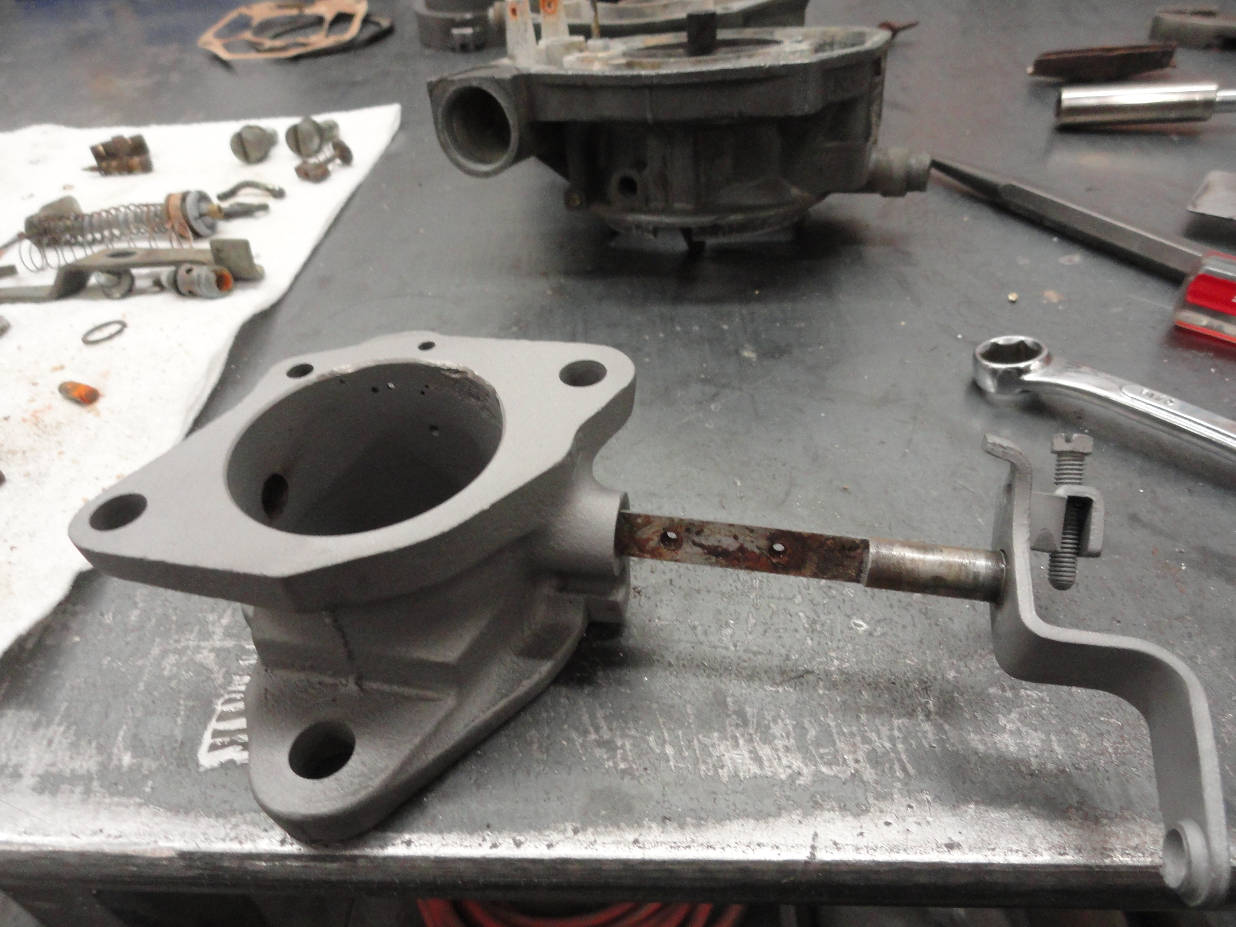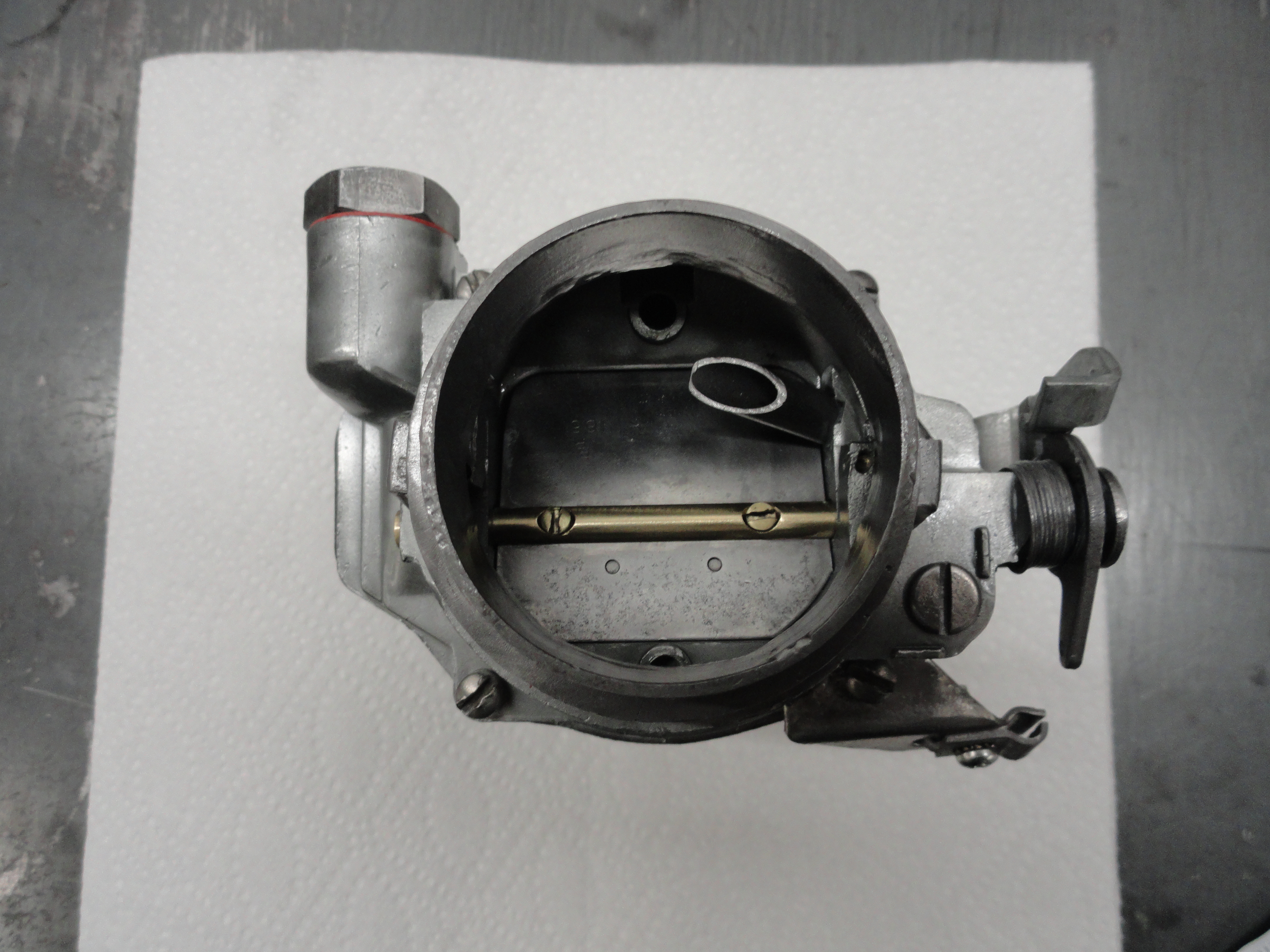 The Base Assembly is really the only part that is different for example between a 250 engine and a 235. It has to do with the spacing between the two mounting flange bolts. Never toss a Rochester B carb that has the wrong mounting bolt pattern. Thats ALL the problem is. Get the correct one and the rest of the carb is good. Remove the Brass idler screw with spring, and the vac advance fitting. If you chose to go the route of removing the bottom butterfly assembly, you should have a totally stripped base unit. The only reason for removing these butterfly assemblies is slop. Slop either side to side, or in and out. Sometimes a brass drift punch will move enough material to stop the slop where the steel and brass converge. If you are doing this, I assume you fully understand the workings of a shaft and its supporting mechanisms and how to proceed. Ideally, NO slop on any plane. You also want to assess if it's tight because of rust or dirt buildup, or if it's really nice and tight! This is why I usually opt to remove both butterfly assemblies.
