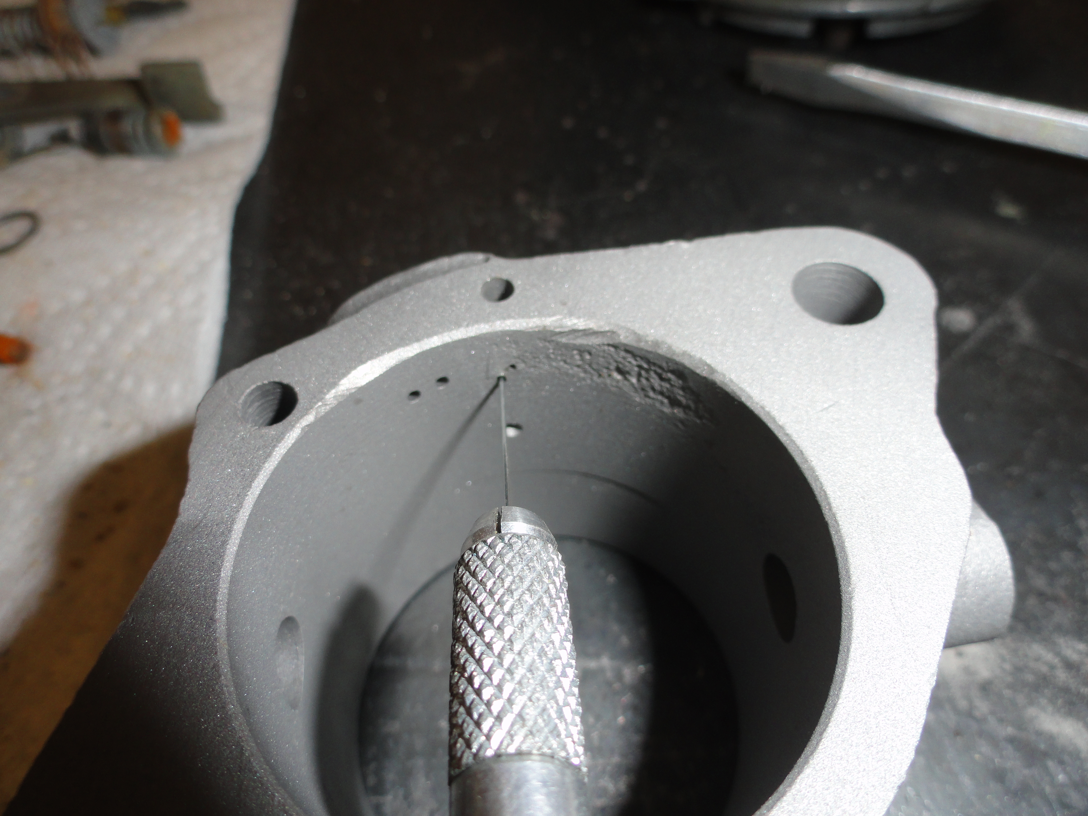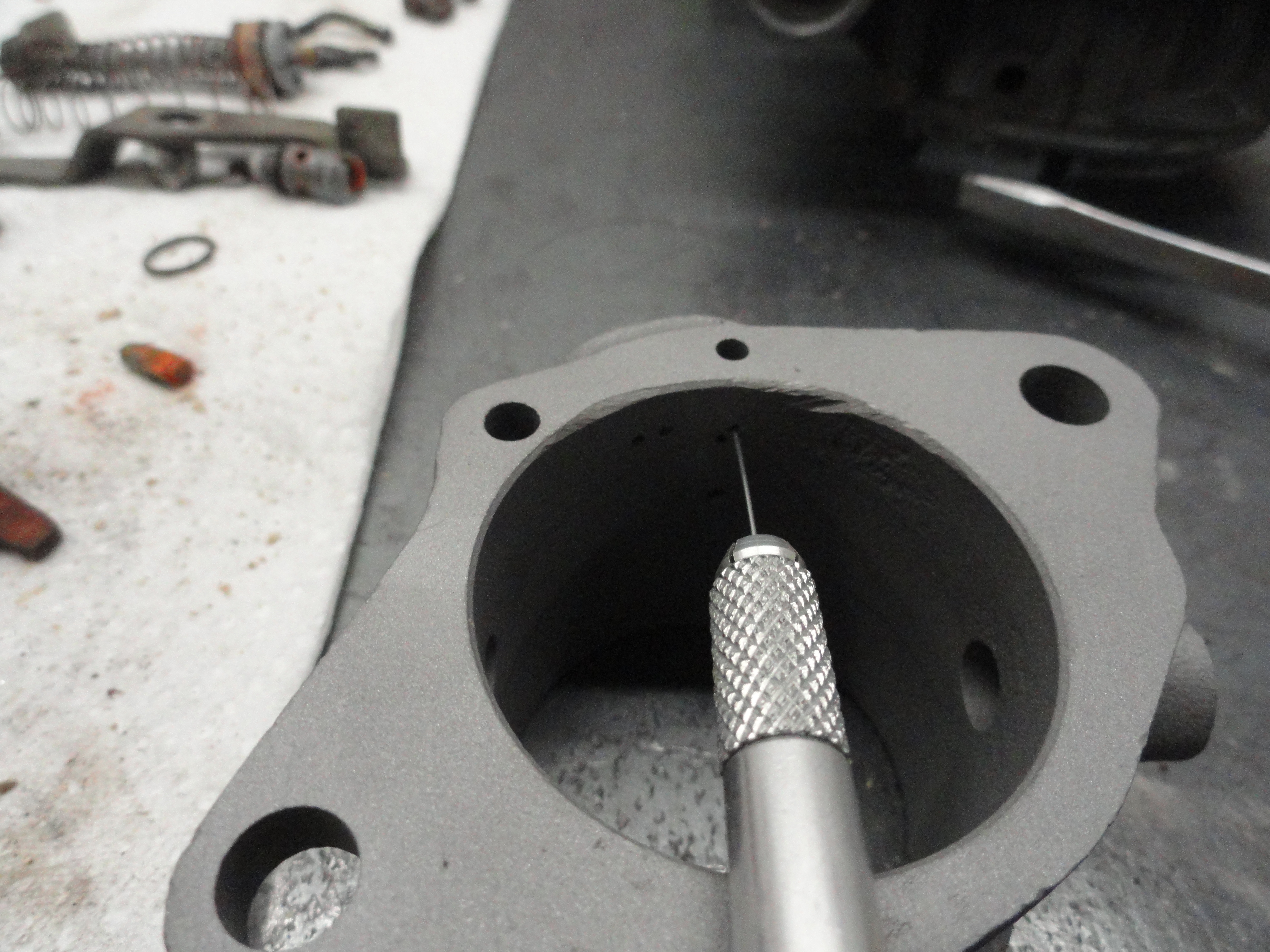 A very good thing to have in the internal cleaning process of all this is something you may have, but haven't thought of for Carburetors. It's the large size cleaning kit for HVLP Paint Guns. If you don't have one, take this opportunity to get one. In it, you will find things that are very important to properly rebuild a carb. For example, the kit has a tube of different size orifice cleaners (basically 2 inch pieces of strong wire of different diameters) as well as bottle brushes and other important cleaning aids. Turns out the holes in these carbs are very small and this kit just works perfect! Once the power piston tower, the piston and spring, jet assembly, etc, is removed, lets move on to removing the butterfly assemblies. Now, I CAUTION YOU! If these assemblies are working VERY freely and there is no end play or wobbling, I leave it up to you as to if you want to go to this trouble! Now that you have been warned, the butterfly on the Air Horn, or top of the Carb is held in by two screws that WILL strip out and cause you great pain and misery if you do not grind the ends off just a little first. Try it but gently and see if they break loose. If they don't, use your Dremel and grind the excess threads off the end of the screws. You will want to use Loctite Red to reassemble them once the screws are ground. Once ground, they should come out pretty easily. The very same is true for the lower butterfly valve. Check first, but if you think you might strip them, grind the ends off. It will save the screws and cause you from having to drill out and re-tap a very intricate assembly.