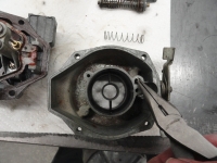 Now that you have totally removed all parts out of the Air Horn (top), let's move on to the Body. Remove that little T-Clip which holds another check ball. It's called the main discharge tube. A lot of times the checkball gets stuck and won't come out. Get it out anyway! It is the other STEEL larger checkball in your Carb kit. Remove the large plunger mechanism, with tower bracket and spring and place them aside. You need to keep everything, even if you see the carb kit has a new one. Why? Personal experience! So now that the body is completely stripped, let's get to the Base Assembly.