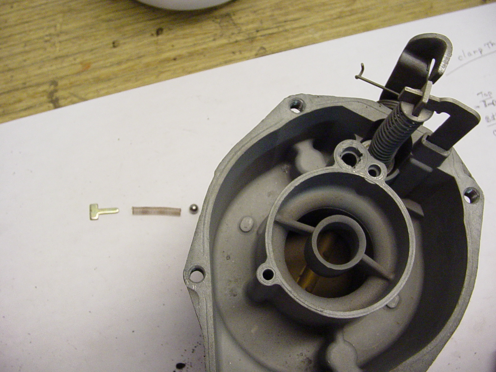 it and watching the movement, set the smallest steel checkball in that hole. Then from the Carb Kit, get that little spring that has tapered ends on it,