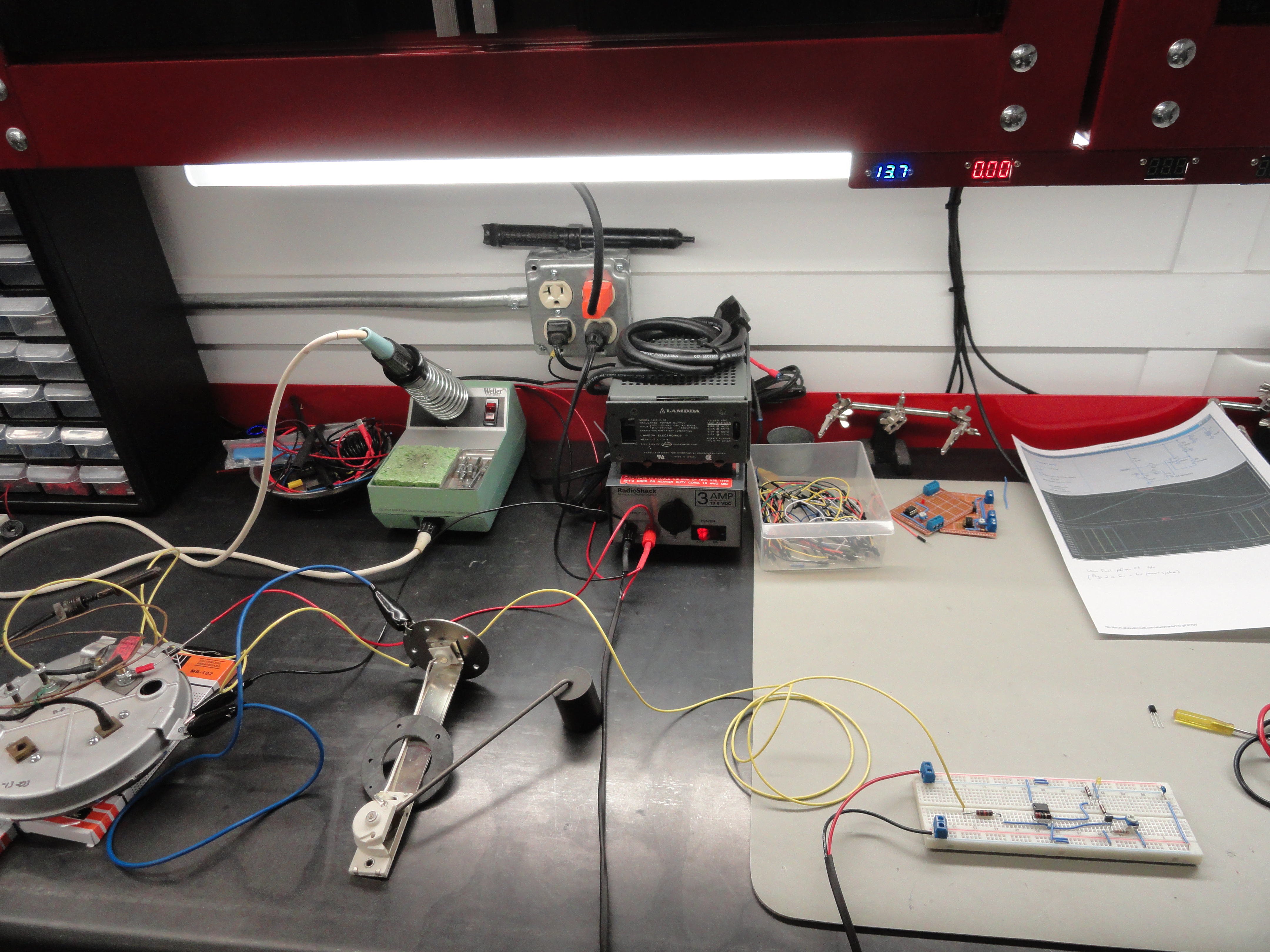 Left is the Protoboard version of the Low Fuel Warning Circuit. Right is the entire Fuel system and how it is hooked up for bench testing.