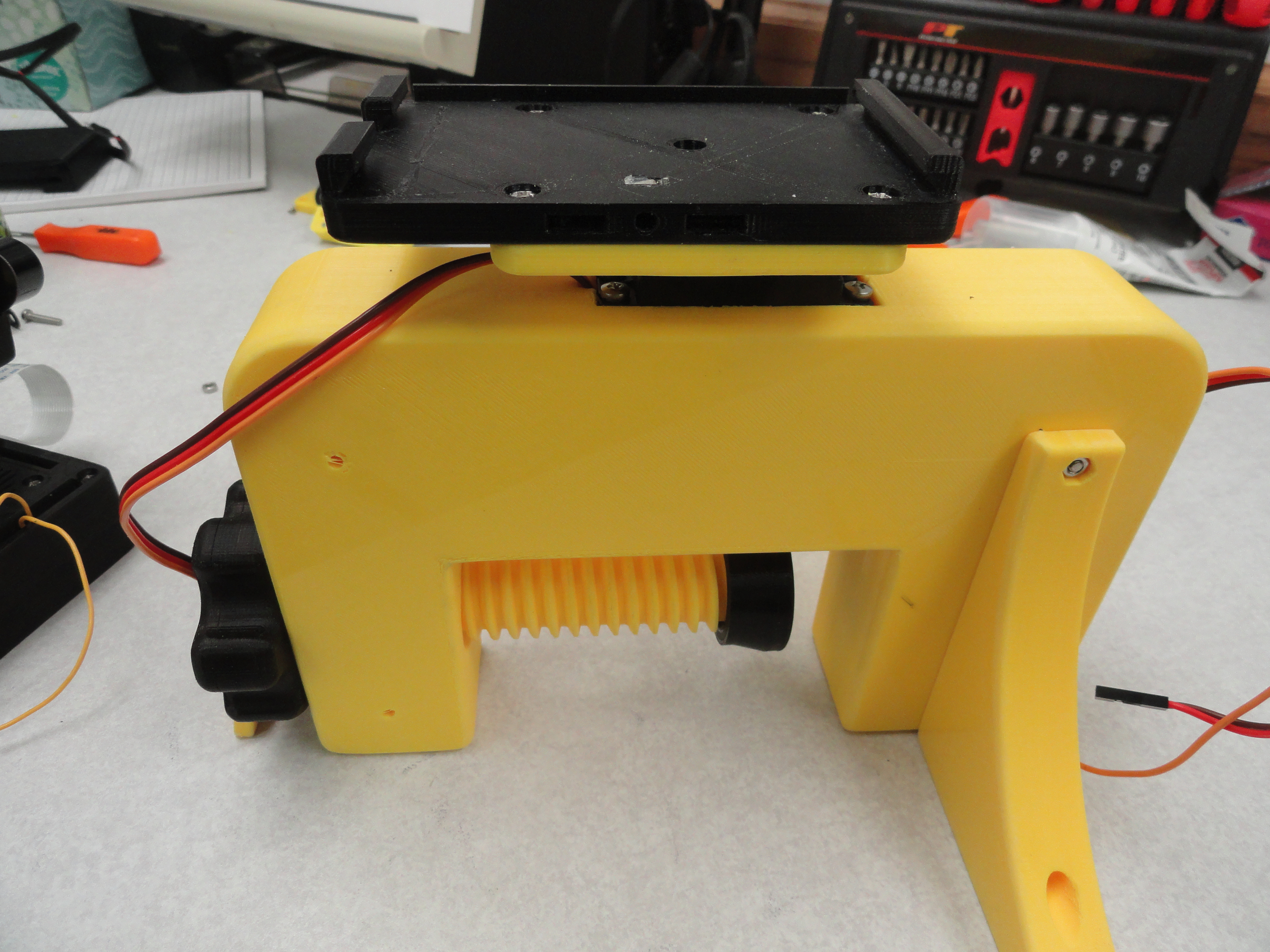 Two of the four Pi Case screws that hold the two halves together also serve as hold-downs for the Servo Gimbal. The Case is made to accept a certain length of screw that is perfect length for each part. If there are threads sticking out, you may be using the wrong screws. The front ones which also hold the gimbal are 3mm x 35mm and the ones in the rear are 3mm x 25mm all using 3mm hex nuts. Turn the gimbal as shown to get better access to the screws.